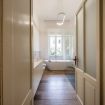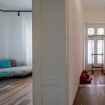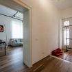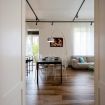 La casa è dotata di impianto domotico BTicino e Vimar, rete con access point Ubiquiti e connessione in fibra Iliad. Il tutto gestito in modo semplice e intuitivo. Ogni ambiente è illuminato da faretti LED dimmerabili, mentre le doppie porte d’epoca in legno massello con vetro fumé donano personalità e stile. Completano l’atmosfera le tende sartoriali in lino e cotone e le originali maniglie Rococò Pop Enrico Cassina in un inconfondibile viola acceso.