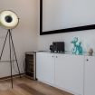 Il soggiorno è ampio e accogliente, perfetto per rilassarsi dopo una giornata in città. Il protagonista? Un maxischermo fisso da 120”, abbinato a un videoproiettore BenQ 4K HDR e impianto audio separato: il tuo personale cinema privato. Il divano di design firmato Ditre Italia completa lo spazio con eleganza e comfort.